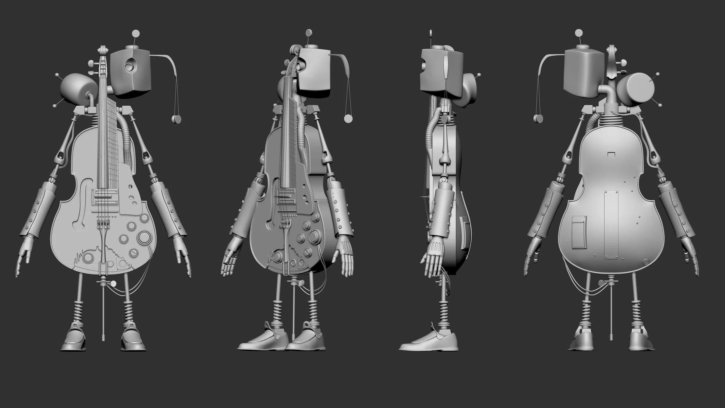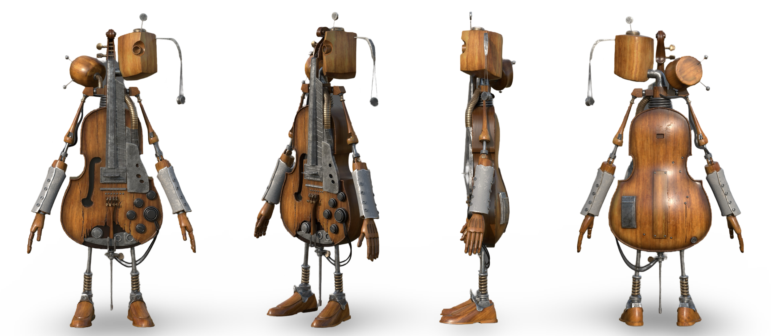 An intricate fusion of musical instruments and mechanical components, designed to embody both artistic expression and functional precision. Harmonix’s central body is constructed from a stringed instrument, resembling an electric guitar or violin, with strings stretched across its form, serving as both a structural and musical element. Its limbs, crafted from metallic and wooden parts, integrate seamlessly with knobs, tuning pegs, and wires, symbolizing its ability to produce and manipulate sound.