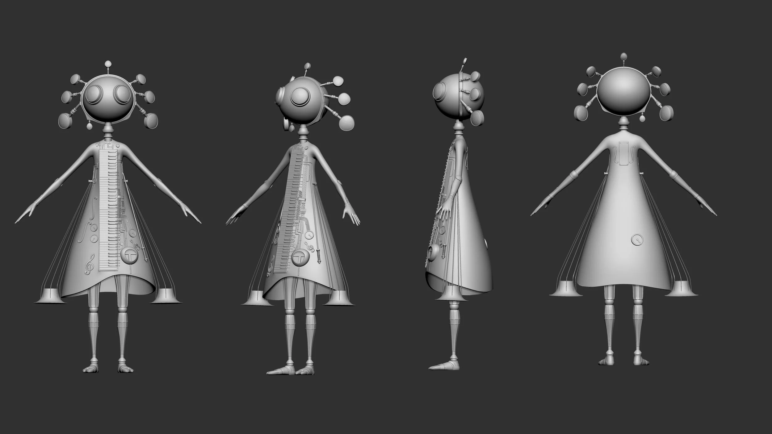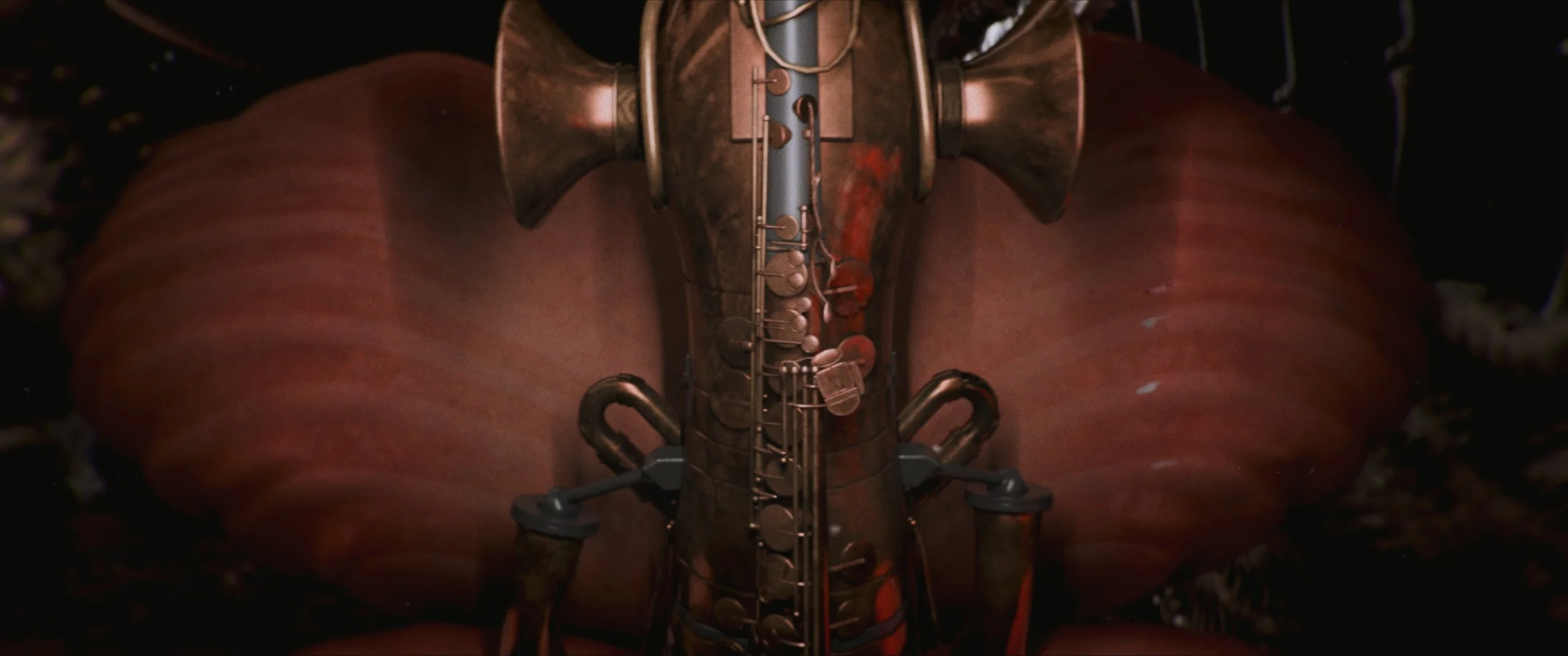 From the outset, my aim was to let each witness represent a different facet of the protagonist’s fractured identity. The Electric Guitar hybrid was conceived as a sharp, almost aggressive presence, reflecting external judgment and the violence of ridicule. The Synthesizer creature, with its blend of analog keys and digital circuitry, symbolised mechanisation and the uncertainty of being caught between human and machine. Finally, the Saxophone automaton embodied delirium and emotional collapse, its form twisting into an overwhelming spectacle of sound and body.
