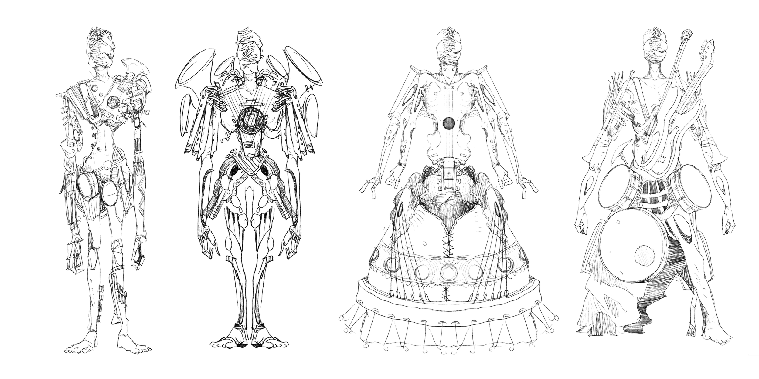 The design of the Three Witnesses was central to the visual development of Death of Fles. I imagined each figure as a hybrid of musical instrument and monstrous body, embodying both the act of testimony and the haunting dissonance of self-expression.