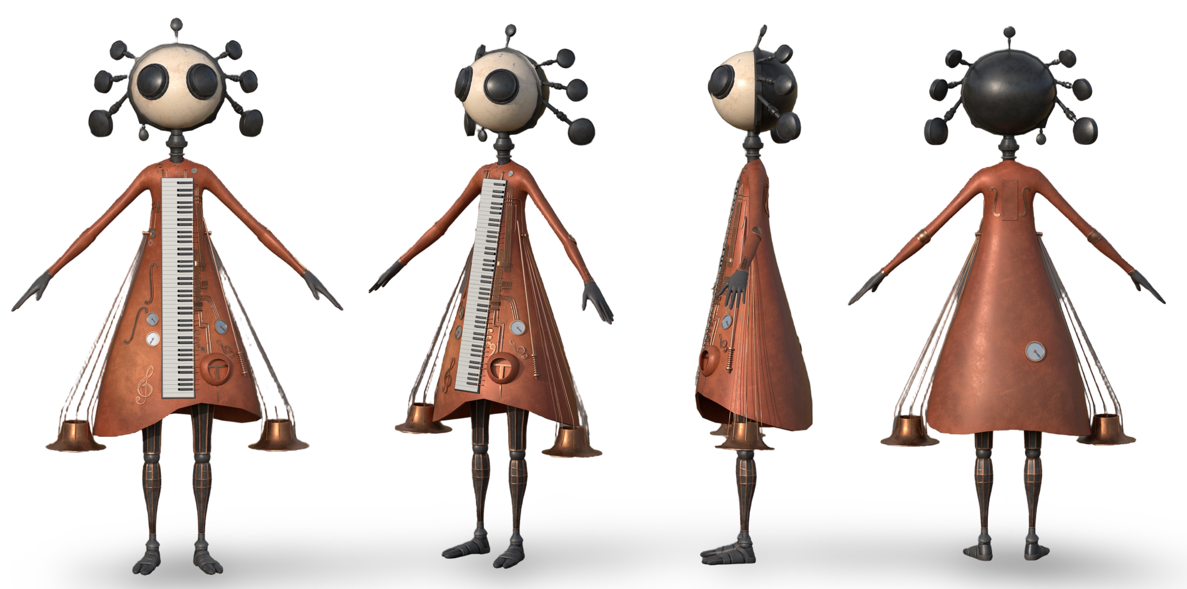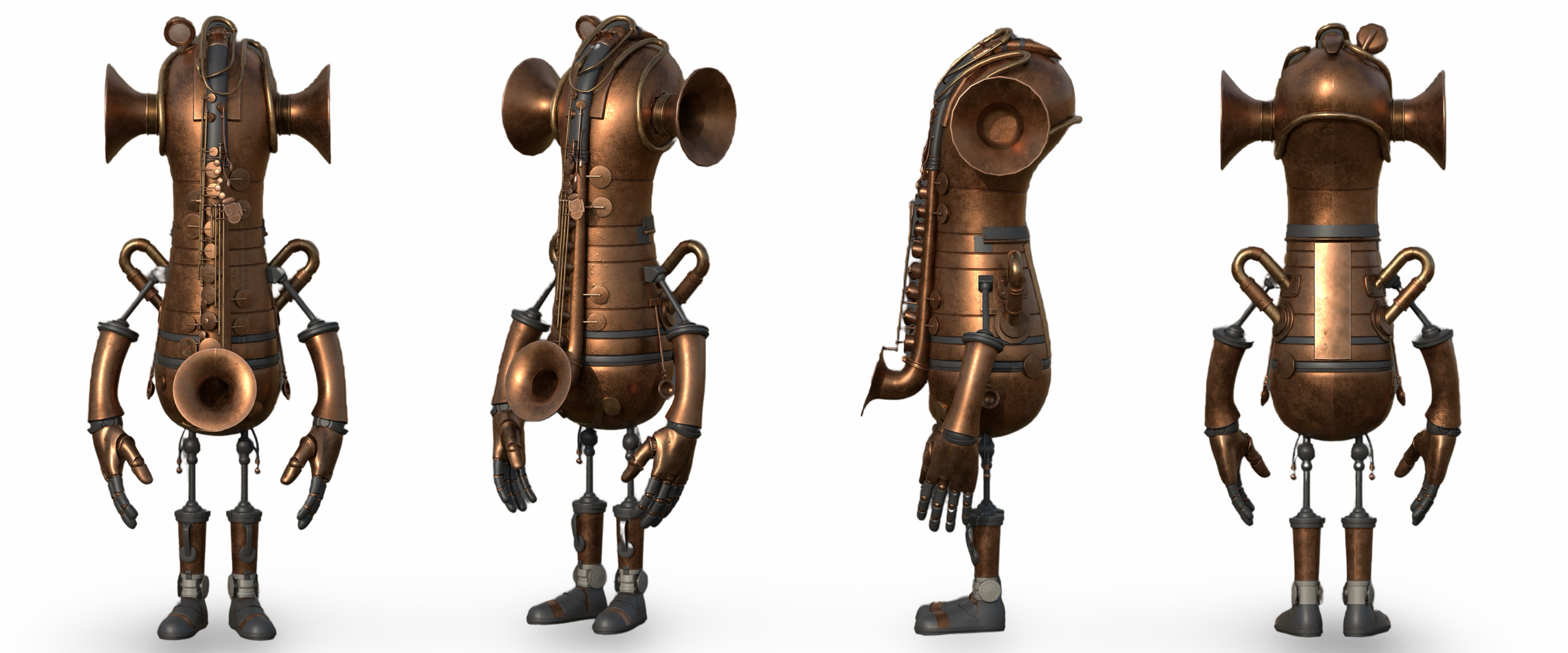 a musical automaton crafted from the soul of brass instruments. Built to resonate with the powerful, resonant sounds of trumpets, horns, and saxophones, Brassius produces deep, melodic tones with each movement. Its form combines precision engineering with musical artistry, embodying the timeless beauty and power of brass music. Every part of its body is designed to create and amplify sound, making it a living orchestra in a world where music and machinery coexist.