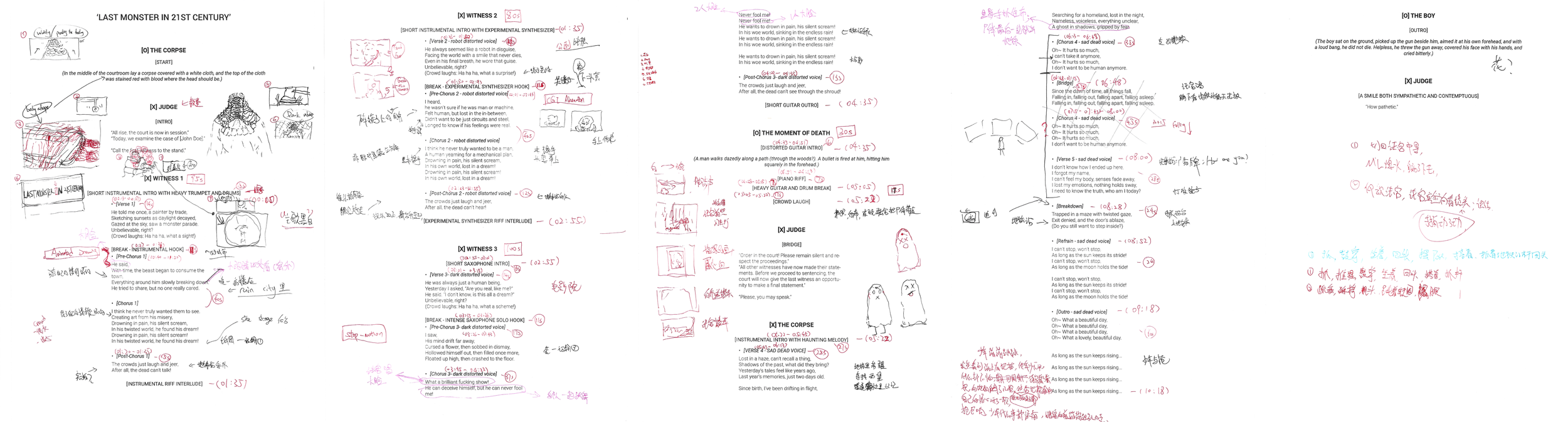 Through sketches, colour studies, and material explorations, I pushed these designs to balance the grotesque and the expressive. Each witness is not simply a character, but a performative atmosphere—an extension of the trial itself. By merging the organic and the instrumental, the Three Witnesses became embodiments of alienation, voicing fragments of the corpse’s life while revealing the monstrous tension between art, memory, and identity.