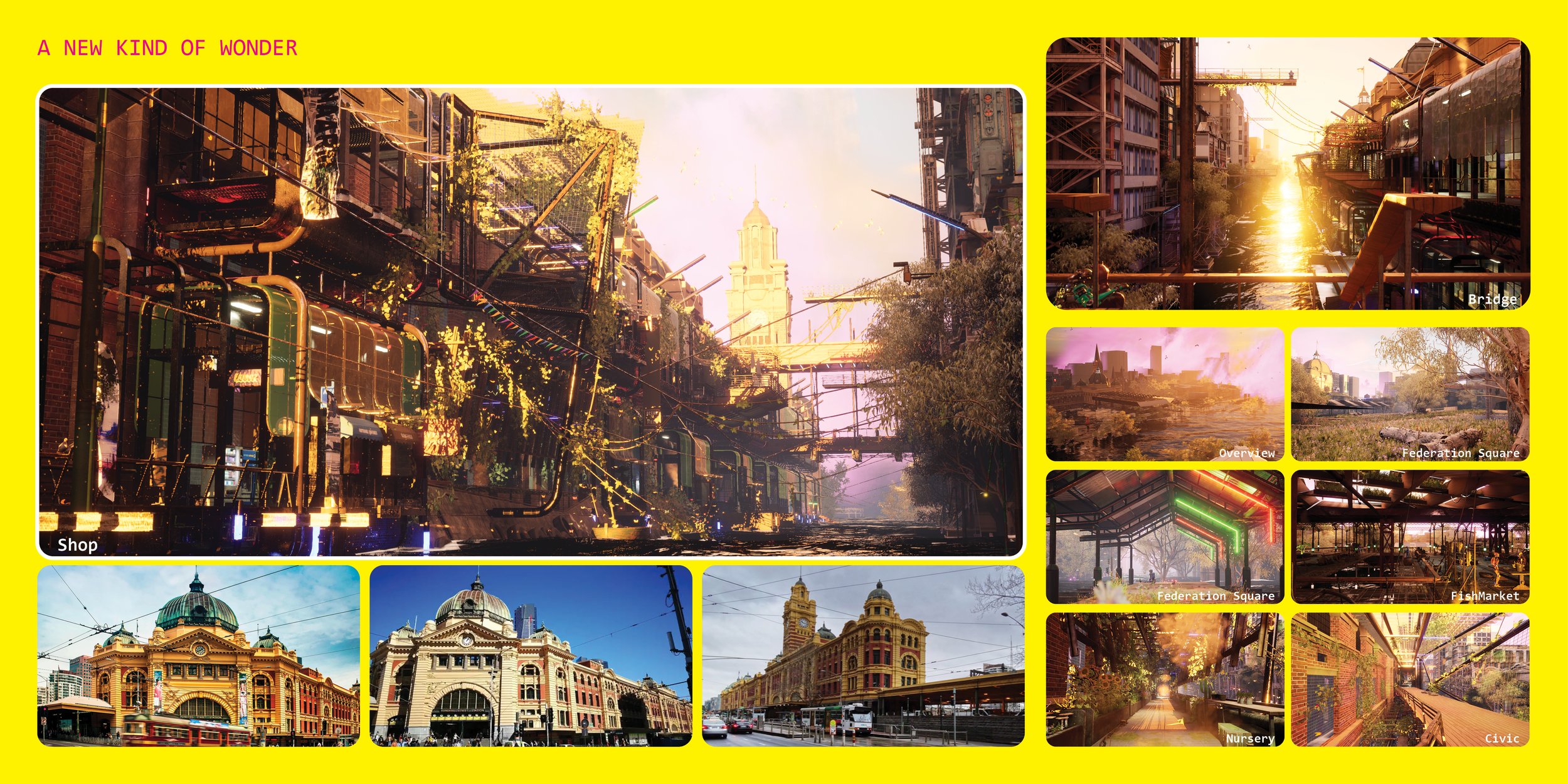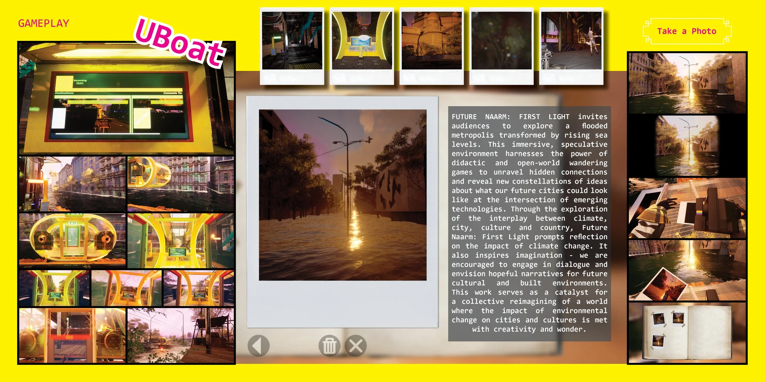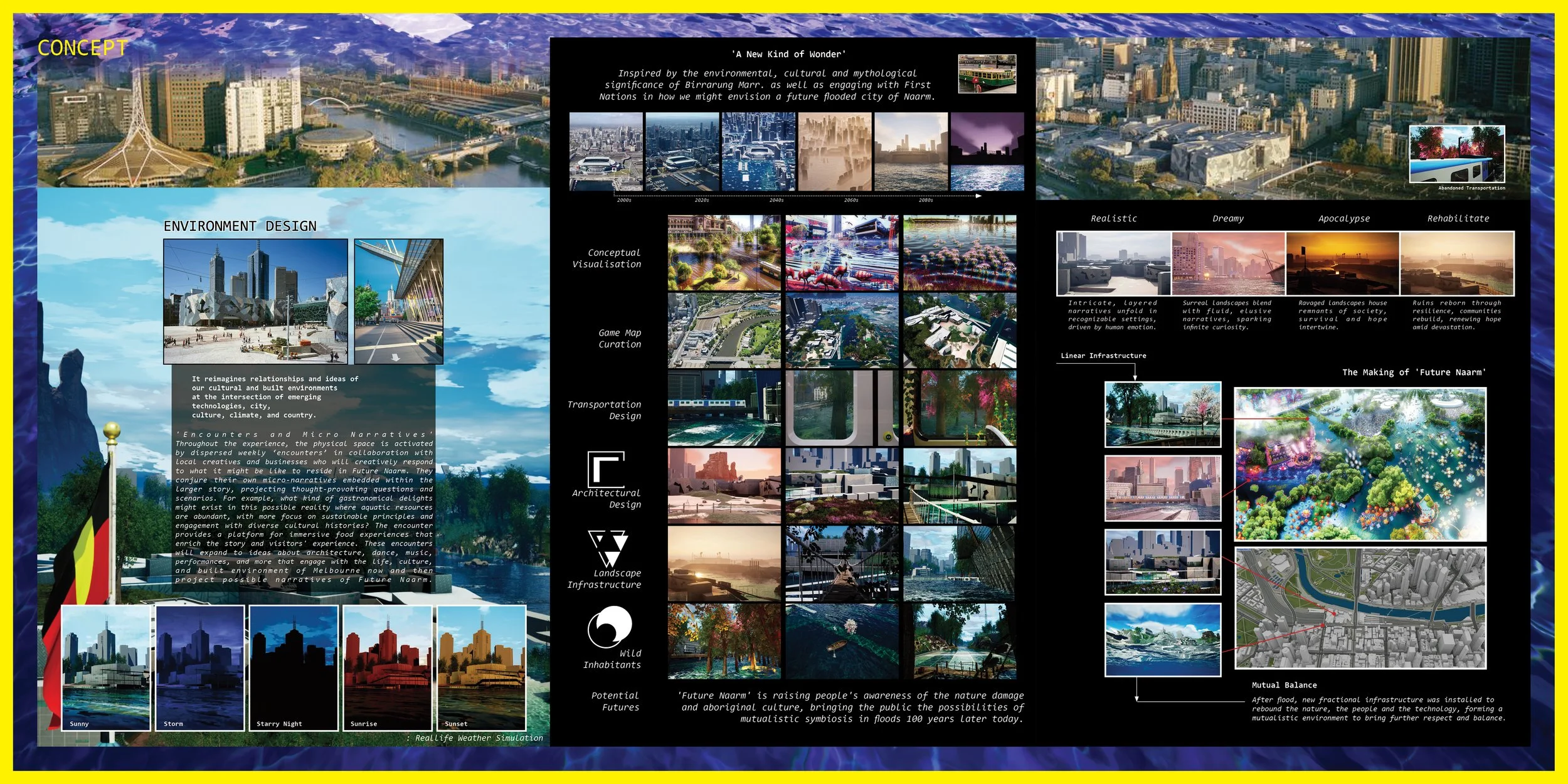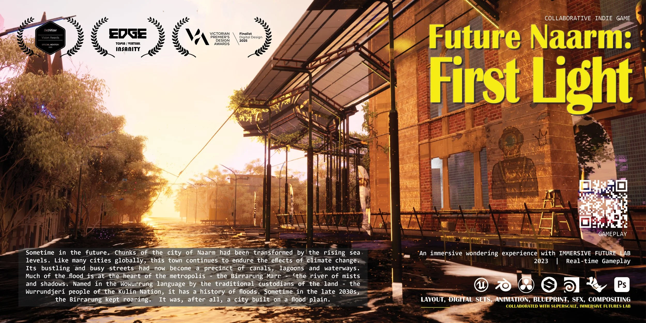FUTURE NAARM: FIRST LIGHT invites audiences to explore a flooded metropolis transformed by rising sea levels. This immersive, speculative environment harnesses the power of didactic and open-world wandering games to unravel hidden connections and reveal new constellations of ideas about what our future cities could look like at the intersection of emerging technologies. Through the exploration of the interplay between climate, city, culture and country, Future Naarm: First Light prompts reflection on the impact of climate change. It also inspires imagination - we are encouraged to engage in dialogue and envision hopeful narratives for future cultural and built environments. This work serves as a catalyst for a collective reimagining of a world where the impact of environmental change on cities and cultures is met with creativity and wonder.
