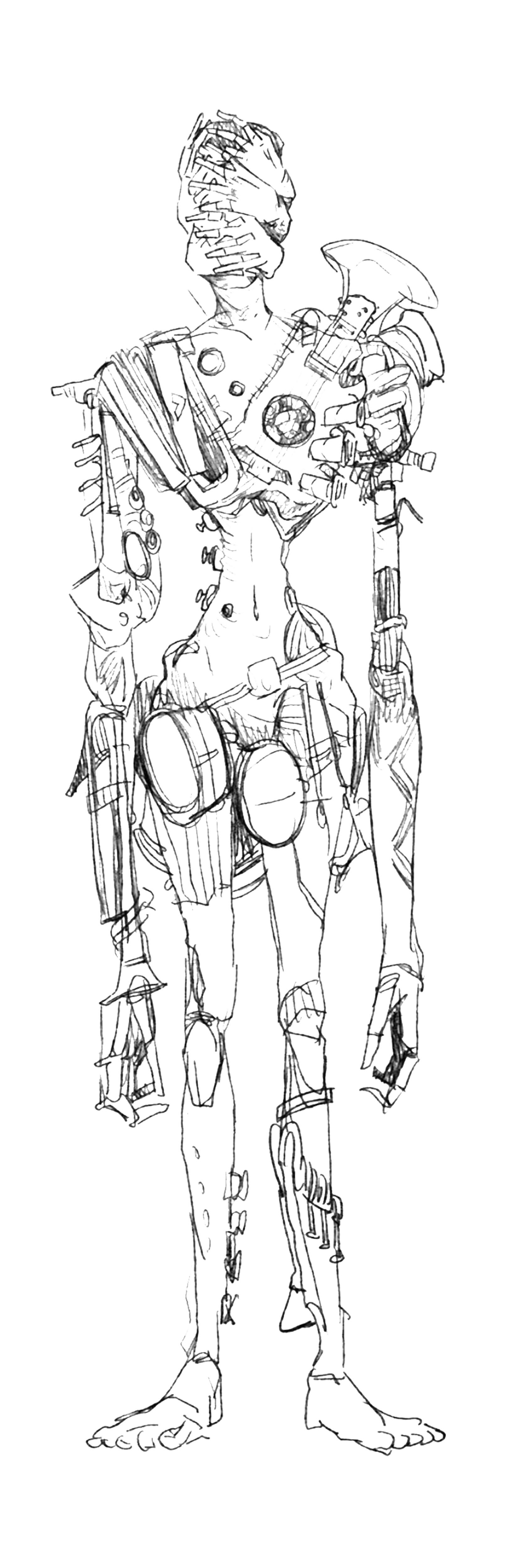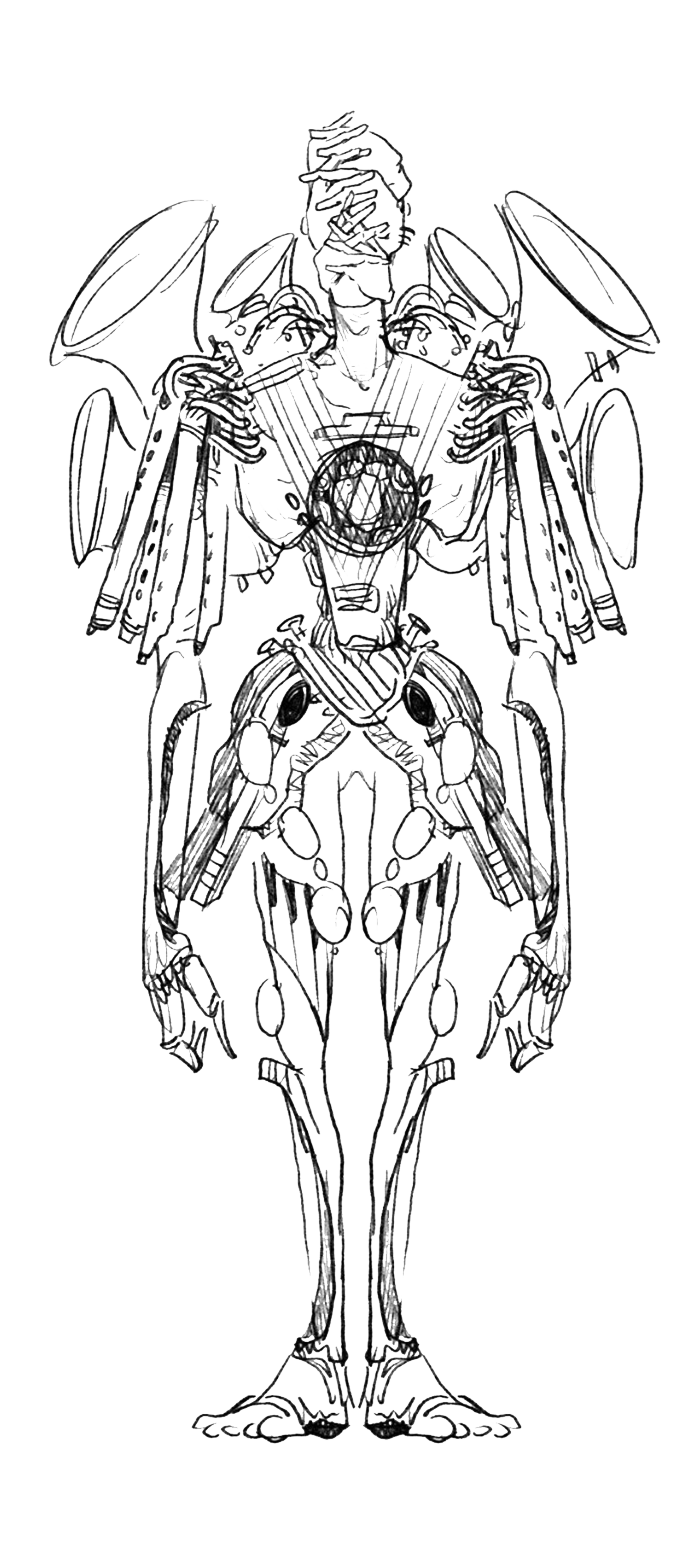 An intricate fusion of musical instruments and mechanical components, designed to embody both artistic expression and functional precision. Harmonix’s central body is constructed from a stringed instrument, resembling an electric guitar or violin, with strings stretched across its form, serving as both a structural and musical element. Its limbs, crafted from metallic and wooden parts, integrate seamlessly with knobs, tuning pegs, and wires, symbolizing its ability to produce and manipulate sound.