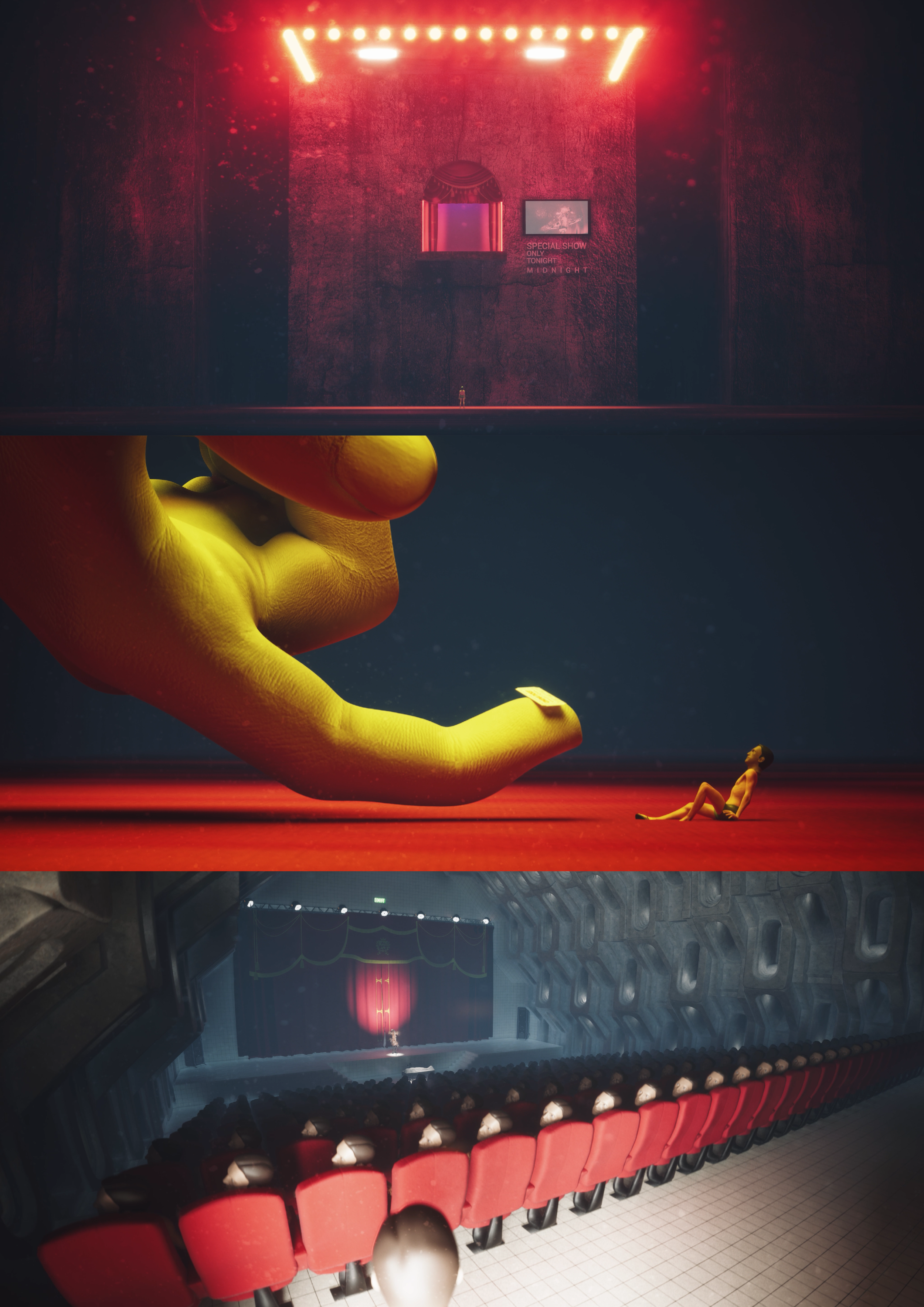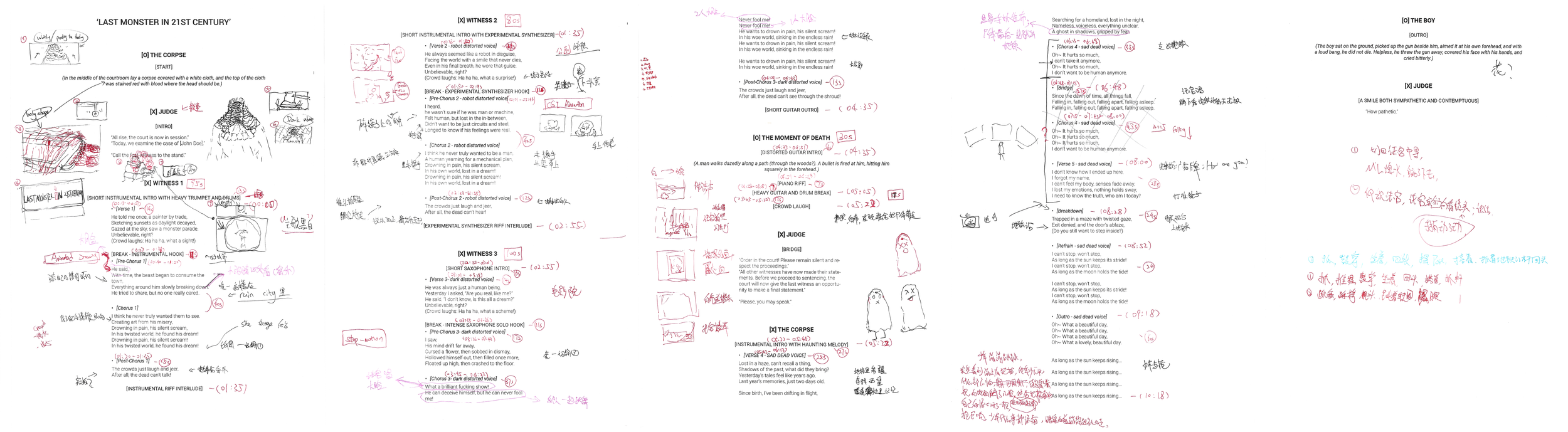 This short film centers on the courtroom trial of a corpse, and explores themes of identity, alienation, and the human condition through a surreal narrative. Set against a backdrop of fragmented memories and musical performances, "Last Monster in 21st Century" reflects on a man consumed by internal and external monsters, symbolising societal neglect and isolation. As the protagonist grapples with his existence — caught between being human, machine, or something else. With the Judge and three witnesses, the trial begins. Witnesses, depicted as creatures made of musical instruments, embody the tension between self-expression and inner turmoil, offering fragmented views of the corpse’s life. The project employs non-linear storytelling, blending music, animation, and abstract visuals to explore the complex relationship between alienation and identity.